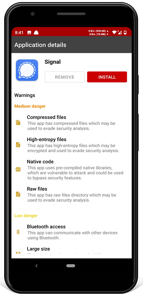 Instalar le permite instalar nuevas aplicaciones. Una vez descargada, la aplicación se analiza mediante un análisis heurístico. Las advertencias se muestran antes de permitir la instalación. Para evitar la instalación de aplicaciones falsas, las claves de las aplicaciones populares están integradas. Las actualizaciones de las aplicaciones deben realizarse con la clave existente, por lo que un servidor comprometido no puede enviar una actualización maliciosa.